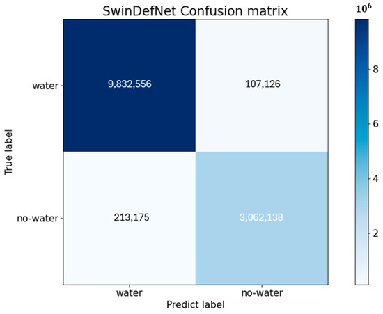 In an effort to enhance the reliability and precision of our methodology, we carried out experiments across different regions to assess the performance of U-Net, ResNet, DeepLabv3+, and DeepWaterMapv2 in regions characterized by cloud cover and mountainous terrain. The outcomes pertaining to accuracy and F1 score are depicted in Figure 11 and Figure 12, respectively. Detailed numerical data on the four evaluation metrics for the five methods across the three regions and the complete validation dataset are presented in Table 3. Figure 13 shows the confusion matrix for SwinDefNet.