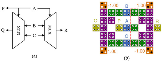 As shown in Equation (3), the logic expression of the 2-to-1 MUX can be expressed with three majority gates, and is the same as the output Q of the Fredkin gate shown in Table 1. Also, if the order of the two inputs and B and C is changed, the result of Equation (3) is the same with the output R of the Fredkin gate. Therefore, a well-made 2-to-1 MUX can determine the performance of the Fredkin gate.