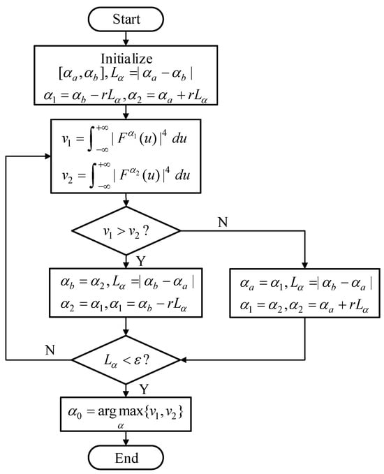 The search for the maximum value by (9) requires a two-dimensional search in the FRFT domain, which requires a large amount of computation []. To improve the computation speed and reduce the amount of computation, scholars have proposed various improved algorithms. Aldimashki et al. used the GSS iterative algorithm to search for the optimal order of FRFT []. The algorithm used the golden ratio for interval division and simplified two-dimensional search into one-dimensional search, which could effectively reduce the amount of computation, complete the optimal order estimation with the least number of iterations, and approach CRLB under low SNR. To further improve the resolution and reduce the influence of noise, an improved GSS-FRFT method is proposed in this paper, which uses 4-order origin moment instead of the maximum to search the optimal rotation angle. Since the period of for LFM signals is and the Doppler rate, K, is a negative number, the initial interval of is . The flow is shown in Figure 3. First, initialize and according to the initial search interval . Then, FRFT is performed under the angles and , respectively, and the corresponding 4-order origin moments and are obtained. Compare and , and retain the angle corresponding to the larger value of the 4-order origin moment and update the other angle. Cycle the above operation until the interval length is less than the set accuracy. The optimal rotation angle is the angle corresponding to the larger value of the 4-order origin moment of the FRFT.