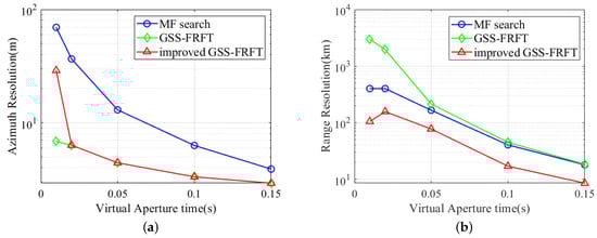 In addition, the paper gives the resolution comparison curves of the existing passive virtual aperture location method based on matched filters [], GSS-FRFT and improved GSS-FRFT. The Monte Carlo simulation results are shown in Figure 4. The results show that the resolutions can be better with the longer virtual aperture. In addition, the method based on improved GSS-FRFT can effectively improve the azimuth and range resolutions compared with the matched filters method, and improve the range resolution compared with the GSS-FRFT method.