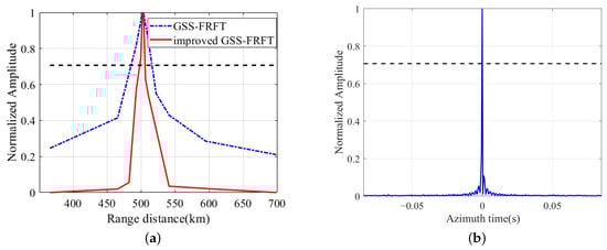 Figure 5 shows the estimation results of the Doppler. Figure 5a shows GSS-FRFT based on maximum search and 4-order moments results, respectively; the optimal rotation angle of the FRFT is . The range resolution for maximum search GSS-FRFT is 23.25 km, and for improved GSS-FRFT is 6.25 km. So, improved GSS-FRFT can improve the resolution of range distance. Figure 5b shows the FRFT result at . The azimuth distance resolution is 3.308 m. So, the chirp rate and the Doppler center time can be calculated by (8), which are and . The location of the satellite at and the estimation, , are used to estimate the effective velocity and realize the location. The satellite velocity is , and the estimated effective velocity is . The location error is 1.398 km.