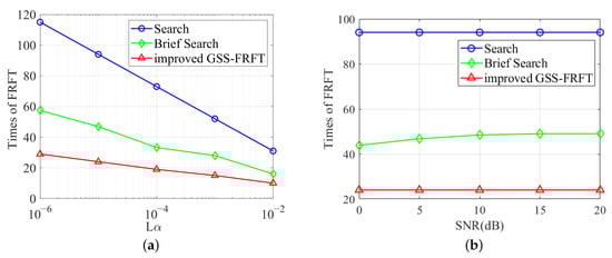 Figure 6 shows the comparison of FRFT times between the improved GSS-FRFT method and other FRFT search methods [,] under a different search accuracy and SNR, where SNR = 5 dB in Figure 6a and search accuracy in Figure 6b. Compared with other search methods, the improved GSS-FRFT algorithm requires fewer search times, and only needs about 20 times to achieve a high-precision search.