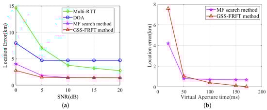 The location error curves of different location methods. (a) Location error versus SNR. (b) Location error versus virtual aperture time.