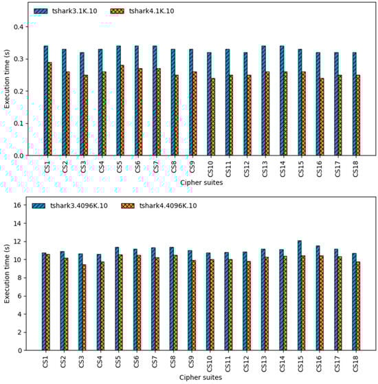 Figure 3 shows the results of running tshark version 3 and version 4 with workloads 1K.10 and 4096K.10. As for the other parameters, we did not include them all because the patterns are similar. tshark3 refers to the stock version that can be installed as a package on Ubuntu server machines, while tshark4 is built from source code. The versions used were 3.2.3 for tshark3 and 4.0.6 for tshark4. While there are minor variations between cipher suites, these are considered within the margin of experimental error. It is observed that tshark4 generally shows 10% to 20% better performance than tshark3. Therefore, for future experiments, tshark3 is excluded, and only tshark4 is used for further testing.