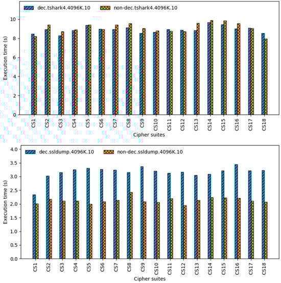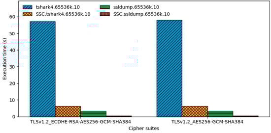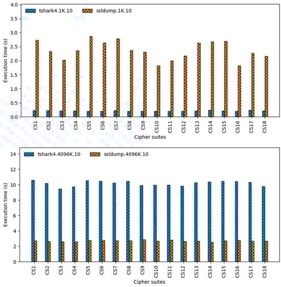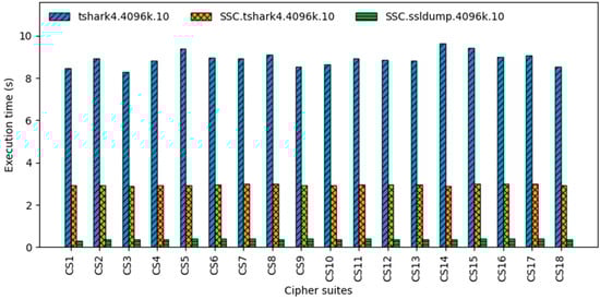 Initially, the decryption performance was compared among tshark, SSC with tshark, and SSC with ssldump for workloads consisting of 1000 sessions of 1 KB size and 10 sessions of 4096 KB size using machine A. As shown in Figure 9, for a large number of small-sized sessions, SSC with tshark proved superior performance across all cipher suites. SSC with ssldump showed lower performance, consistent with its inherent low performance for 1000 sessions of 1 KB size in the baseline.