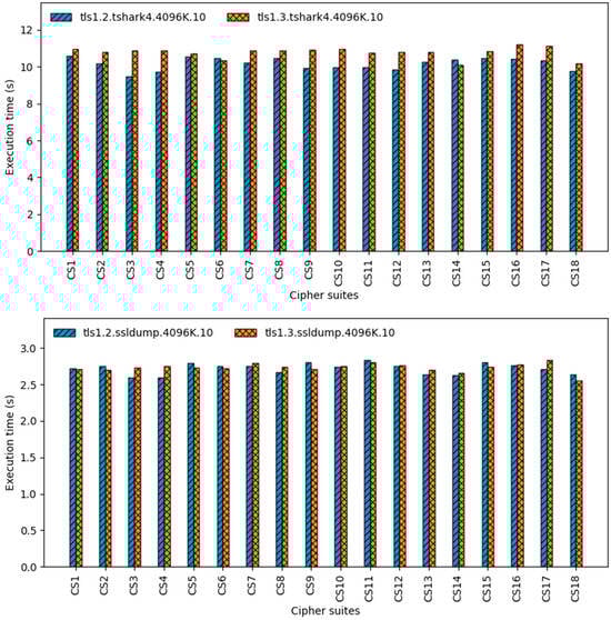 The results comparing TLS 1.2 and TLS 1.3 are shown in Figure 5. Using tshark, we observed that TLS 1.3 takes slightly longer than TLS 1.2. However, when using ssldump, the performance was similar within the margin of experimental error. This suggests that there is no significant difference in decryption performance between TLS 1.2 and TLS 1.3. Therefore, from a decryption performance perspective, the choice between TLS 1.2 and TLS 1.3 does not show substantial significance. Therefore, we used TLS 1.2 which is the most popular after Section 5.