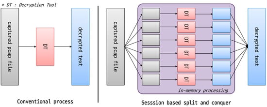 Upon analyzing the decryption process, we observed that these programs spend more time on packet disassembly and reassembly than on actual decryption. To address this issue, we employed the Session-based Split and Conquer (SSC) method to divide the pcap file into segments and utilized multiprocessing techniques to decrypt each segmented pcap file. Furthermore, to increase the disk I/O speed of a huge amount of pcap files, we devised an additional in-memory version using asynchronous processing with tmpfs. When evaluating the execution time performed by SSC for tshark4 with packet sizes of 4096k with 10 sessions, the following time reductions were observed compared to standard execution: 40.2% reduction in the native environment, 50.3% reduction in the asynchronous environment, and 68.2% reduction in the in-memory environment. For packet sizes of 4096k with 1000 sessions, tshark4 demonstrated a time reduction of 93.5%, while ssldump showed a reduction of 97.4%.