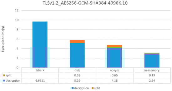 Using Machine A, we compared decryption performance between tshark in a normal environment with SSC, tshark in an asynchronous disk environment with SSC, and tshark in an in-memory environment with SSC. Figure 8 shows the decryption times for ten 4096 KB packets encrypted with TLSv1.2_AES256_GCM_SHA384 under each condition. The split legend indicates the time taken to split the pcap file, while the decryption legend represents the time taken for decryption.