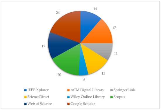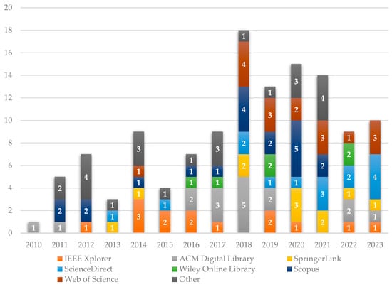 The 124 selected publications across various online academic libraries as follows; 24 papers from Google Scholar identified through snowballing, 20 from Scopus, 17 (plus 2 from snowballing) from ACM Digital Library, 17 from Web of Science, 14 from IEEE Xplorer, 15 (plus 1 from snowballing) from ScienceDirect, 11 from SpringerLink, and 6 from Wiley Online Library. This distribution is visually summarized in Figure 1, highlighting the diverse academic libraries that contributed to the research published between 2010 and 2023.