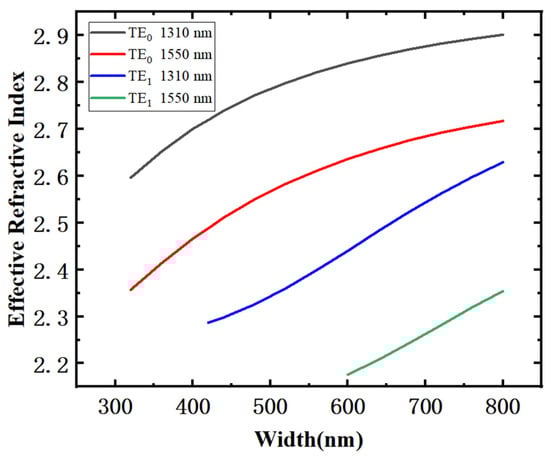 The microring structure used for the modulator design in this article consists of a single-waveguide coupling structure (a microring resonator and a straight waveguide) with a coupling region between the straight waveguide and the ring in the middle. The device is designed based on a commercially available SOI wafer with the top silicon layer thickness of 220 nm, and will be processed in Shanghai μTechnology Industry Research Institute (SITRI). Considering that SITRI’s MPW process provides an etching depth of 130 nm for the top silicon layer, the slab thickness of the ridge waveguide is set to be 90 nm. The device is designed to be worked in TE mode in both the O-band and C-band. So, the design of the waveguide width should enable single-mode transmission in both the O-band and C-band. We subsequently conducted simulations of the effective refractive index of TE mode changing with the width of the ridge waveguide at a wavelength of 1310 nm (O-band) and 1550 nm (C-band). From Figure 1, it can be seen that when the width of the ridge waveguide is greater than 420 nm, higher-order modes appear in the waveguide, causing additional losses that are not conducive to single-mode transmission. Therefore, we ultimately designed a ridge waveguide width of 420 nm.