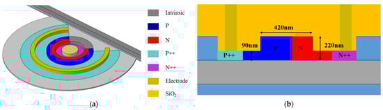 The cross-sectional diagram of the microring modulator is depicted in Figure 2. For the convenience of observation, Figure 2a omits the upper layer of silica dioxide. A horizontal transverse PN junction is embedded in the ring waveguide, with a simple four-step doping method employed, incorporating light doping in the ridge waveguide region and heavy doping in the slab layer for metal contact. To leverage the refractive index change resulting from variations in hole concentration, which is greater than that caused by changes in electron concentration (as shown in Equation (1)), a non-symmetrical PN junction structure is adopted, shifted 40 nm toward the N region, in pursuit of enhanced modulation efficiency.