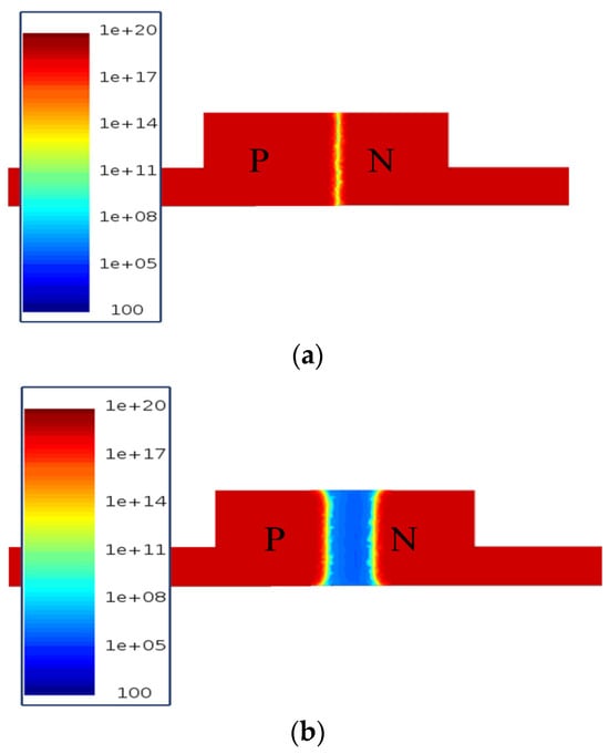 Simulated carrier distribution at (a) 0 V and (b) 6 V reverse bias.