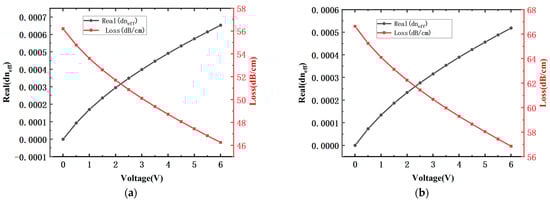Under wavelength conditions of 1310 nm and 1550 nm, the presence of the free-carrier plasma dispersion effect causes changes in the effective refractive index and optical loss of the phase-shifting arm from a 0 V to 6 V reverse bias voltage. Figure 4a,b, respectively, show the changes in the effective refractive index and loss of O-band and C-band light transmitted in the ridge waveguide. In addition, applying a reverse bias voltage on the PN junction will reduce the carrier concentration. As the voltage increases, the carrier concentration changes slowly and tends to saturate, making the curve nonlinear. It is observed that the effective refractive index change increases with higher bias voltages, while the optical loss decreases with increasing bias voltage.