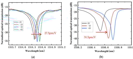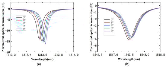The transmission spectrum of the manufactured microring modulator under different DC biases. (a) O-band; (b) C-band.