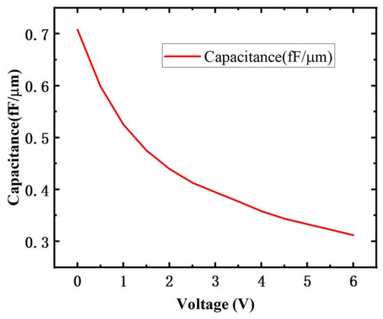 From Equation (5), one can find that to improve the EO bandwidth of the MRMs, the, -factor, , and should be decreased, while all of them are mostly dependent on the doping concentration. According to the transmission spectral lines in (a) and (b) of Figure 5, Formula (2) can be used to obtain the values of the device in the O- and C-bands, and the optical bandwidth of the device can be obtained, which is 38 GHz and 55 GHz, respectively. The variation in the unit junction capacitance of the PN junction depletion region with a reverse bias voltage can be obtained from the model, as shown in Figure 6. can be calculated as 150 ohms through simulation silicon slab layer doping, and the EO bandwidth of the device can be obtained through Formula 3, which is 34 GHz in the O-band, and in the C-band, it is 41 GHz at −4 V.