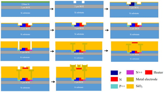 The devices are fabricated using the 8-inch silicon photonics platform from the Shanghai Industrial μTechnology Research Institute, and the standard process of device fabrication is shown in Figure 7. A layer of silicon dioxide hard mask was deposited on SOI wafers by using plasma-enhanced chemical vapor deposition (PECVD), and the top layer of 220 nm silicon was photo-lithographed, leaving behind a ridge waveguide with a height of 220 nm and a silicon slab with a height of 90 nm after removing the photoresist. The next steps were as follows: depositing a 10 nm thick silicon dioxide barrier layer on the silicon surface by using PECVD, lightly doping the ridge waveguide P and N regions, doping the silicon slab layer with heavy P and heavy N regions, then depositing silicon dioxide, and dry etching to form through holes, and exposing the heavily doped areas. Interconnecting and conducting were carried out by filling the through holes with a metal alloy AlCu (metal1). Then, silicon dioxide was deposited and followed by chemical mechanical polishing (CMP). A TiN heating layer was deposited and silicon dioxide was deposited to form an upper cladding layer. Subsequently, the upper cladding layer was etched until it made contact with metal1. Then, the metal alloy AlCu was filled to form metal2, and finally, silicon dioxide was deposited and etched to expose the metal pad to perform device testing.