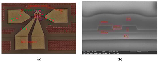 (a) A microscopic photo of the microring modulator on the chip; (b) a cross-sectional view of the coupling region’s annular waveguide and straight waveguide.