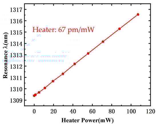 The function of the TiN heater is wavelength tuning of the microrings. The resonant wavelength shifts red with the increase in voltage, and the corresponding resonant wavelength varies with the power of the heater, as shown in Figure 10, with a red shift of about 67 pm/mW.