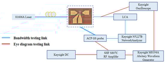 Under a reverse bias voltage of 4 V, the electro-optic bandwidths of the device in the O-band and C-band are 39 GHz and 34 GHz, respectively. Subsequently, we measured the eye diagram results using the setup shown in Figure 11 to comprehensively characterize the high-speed performance of the device. Various rates of (215−1) NRZ Pseudo Random Bit Sequence (PRBS) electrical signals were generated by a clock and code generator, amplified to 2.5 by an RF amplifier, and loaded onto the device. The light output from the laser was fed to the device under test through a polarization controller. The DC probe biased and pressurized the device, and the modulated light signal output by the device was sent to the oscilloscope for detection. Simultaneously, the signal output by the signal generator system was sent to the oscilloscope for reference.