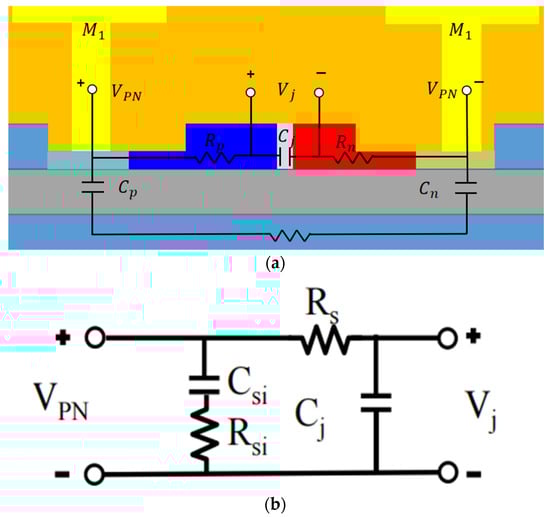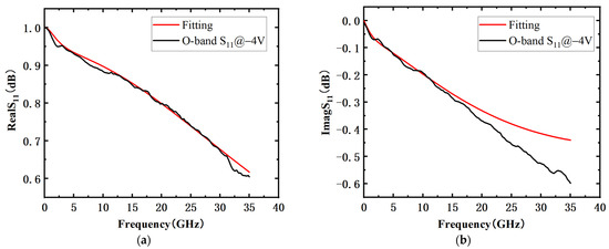 We obtained S parameters based on RF testing and performed parameter fitting. Figure 13a shows the cross-section of the device along with the equivalent circuit diagram overlaid on it. Vpn+ and Vpn- are connected to the S and G terminals of the GS high-frequency probe, respectively. Rn and Rp represent the resistances in the doped Si layer, Cn and Cp represent the capacitances between the doped silicon layer and the silicon substrate, and Rsi represents the resistance of the silicon substrate beneath the device. The capacitance in the depletion region is denoted as Cj when a negative voltage is applied across the junction, with Vj representing the voltage at the junction. Figure 13b presents the Si MRM equivalent circuit, where Rs = Rn + Rp and Csi = Cn || Cp. The real and imaginary parts of the S11 curve fitted by the Si MRM in the O-band are shown in Figure 14, and the fitted parameters are listed in Table 1. It can be observed that the fitting of the real part of S11 closely matches the original data.