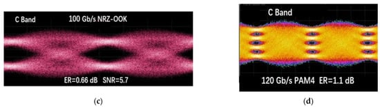 An eye diagram for the ring modulator at a data transmission rate of (a) 100 Gb/s with NRZ modulation in the O-band, (b) 140 Gb/s with PAM4 modulation in the O-band, (c) 100 Gb/s with NRZ modulation in the C-band, and (d) 120 Gb/s with PAM4 modulation in the C-band.