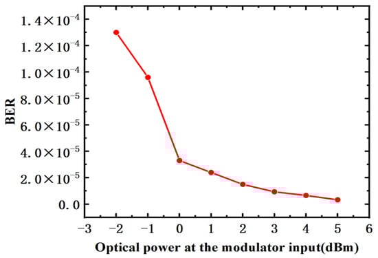 The measured eye diagrams with PRBS15 signals are shown in Figure 15. In the O-band, the NRZ modulation rate of the device reached 100 Gb/s, with an ER of 2.4 dB and a signal-to-noise ratio (SNR) of 3.3. The PAM4 modulation rate reached 140 Gb/s, with an ER of 2.5 dB. In the C-band, the device also achieved excellent performance, with an NRZ modulation rate of 100 Gb/s, an ER of 0.66 dB, and an SNR of 5.7. The PAM4 modulation rate in the C-band reached 120 Gb/s, with an ER of 1.1 dB. The MRM supports data transmission rates exceeding 100 Gbit/s, with a bit error rate (BER) lower than the hard-decision forward error correction (HD-FEC) threshold of 3.8 × 10−3. The relationship between the BER and the received optical power of the device is shown in Figure 16. The higher the received optical power, the lower the bit error rate. Table 2 compares our device with other high-performance devices that have been published. The advantage of our device is that it has a relatively simple doping process, can work simultaneously in the O- and C-bands, and has high speed, small size, and low power consumption. The MRM we designed has great application potential in optical transmitters, playing an immeasurable role in the future field of optical computing and interconnection.