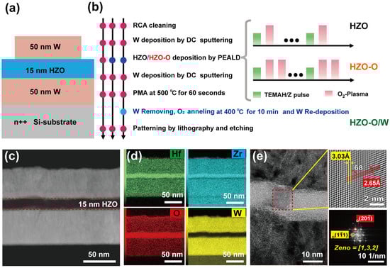 In this work, we fabricated 15 nm thick HZO ferroelectric capacitors. Tungsten (W) was chosen as a capping electrode due to its superior ability to induce orthorhombic phases compared to other electrode materials [6,18,19,20], with the oxygen precursor parameters during HZO deposition having a considerable influence on HZO quality (oxygen defects) [13,21,22]. Furthermore, a synergistic optimized design using the dual-oxygen pulse recipe during HZO deposition and utilizing O2 annealing after PMA process was proposed. We selected 400 °C at 10 min as the O2 annealing condition, after fully considering the basis of the oxygen ion migration rate and HZO phase transition kinetics [23,24]. After systematically comparing the electrical characteristics and analyzing differences in HZO film structure, we demonstrated the mechanism behind enhanced ferroelectric performance. We successfully achieved larger ferroelectric polarization in 15 nm HZO films at lower operating voltages, both with wake-up free operation and improved reliability. Our work places a particular emphasis on developing low-voltage ferroelectric devices for thicker HZO films, thereby presenting a viable solution for the development of low-power memory devices.