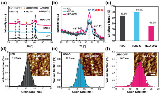 Figure 2a shows the GIXRD data of 15 nm thick HZO layers with different manufacturing processes. Firstly, the diffraction peaks of W(210) and WO2(131) are cleared detected, located at 41° and 38.6°, respectively, which further evidenced the presence of tungsten oxide above the BE-W. A careful observation of the signal range (28~32°) unique to the HZO film, as shown in Figure 2b, allowed us to notice that the strength of monoclinic phase (m-phase, PDF # 04-004-3850) increased significantly after adding oxygen annealing, but it was also difficult to distinguish the signal shift of the orthorhombic (o-phase, PDF# 04-005-5597) and tetragonal (t-phase, PDF# 04-011-8820) phases [27,28]. After a further analysis of the impact of process optimization, the diffraction profiles in the GIXRD results were de-convoluted into three components for a quantitative analysis (m(11), o(111)/t(101), and m(111) diffraction peaks), and the o/t-mixture phase volume fraction was estimated as follows: