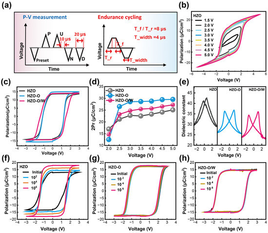 (a) The voltage waveform for P-V measurement and single endurance cycling. (b) The saturated P-V loops for HZO under different voltages. (c) The comparison of P-V loops at 3 V. (d) The variation of 2Pr with voltage. (e) The dielectric constant-voltage (εr-V) curves. The P-V loops after applied different cycles trapezoid wave for (f) HZO, (g) HZO-O, and (h) HZO-O/W devices.