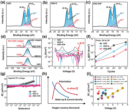 XPS spectra of Hf 4f core level for (a) HZO, (b) HZO-O, and (c) HZO-O/W devices. (d) XPS spectra comparison of O 1s core level. (e) Leakage current density–voltage curves. (f) The leakage current density comparison in 2V voltage after different cycles of trapezoidal waves were applied. (g) Comparison of endurance performance. (h) Effects of oxygen vacancy concentration on ferroelectric performance and reliability. (i) Comparison of 2Pr of 15 nm thick HZO with other reports [17,26,38,39,40,41,42,43].