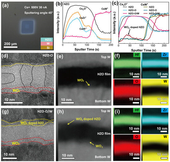 (a) Top view of the HZO device after TOP-SIMS test. (b) TOP-SIMS depth profile of HZO/W by Cs+ ion etching. (c) CsW+ and Cs2O+ depth profile with sputtering time. (d) HRTEM image of HZO-O device. (e) HZO-O morphology image. (f) Corresponding HZO-O morphology combination element mapping image. (g) HRTEM image of HZO-O/W device. (h) HZO-O/W morphology image. (i) Corresponding HZO-O/W morphology combination element mapping image.