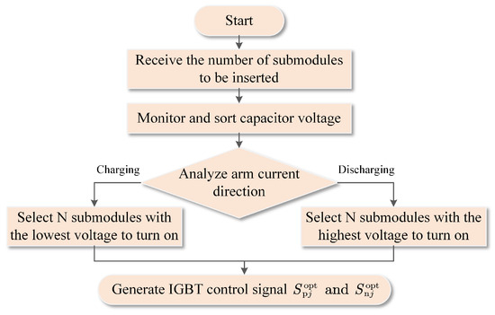By sorting the capacitor voltages and considering the direction of the arm currents, the sub-module capacitor voltage balancing control algorithm is depicted in Figure 4.
