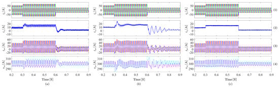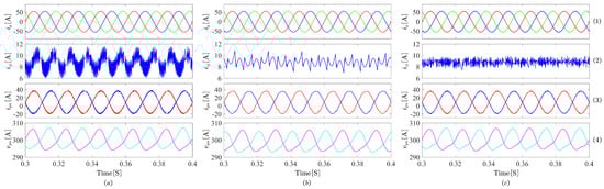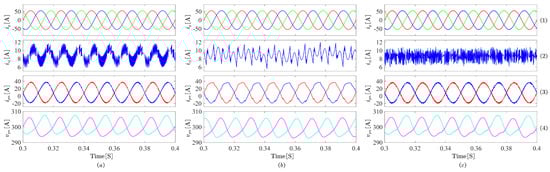 Figure 5 illustrates the overall steady-state performance under the three different control schemes, including three-phase output currents, circulating currents, arm currents, and capacitor voltages.