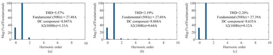 The THD of the arm current: (a) FCS-MPC method. (b) Hybrid PIR-MPC method. (c) Proposed ET-MFAC method.
