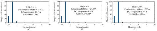 To evaluate the impact of parameter mismatching on steady-state performance, it is assumed that both the arm inductance and the output filter inductance deviate from their nominal values. Figure 8 illustrates the system’s steady-state waveforms when the nominal arm inductance is 2.5 mH while the actual arm inductance is 5 mH. It is evident that the inductance mismatch significantly affects the circulating current and arm current. The total harmonic distortion (THD) of the arm current is shown in Figure 9. As can be seen, the THD values generated by the FCS-MPC, PIR-MPC, and ET-MFAC control schemes are 6.31%, 5.26%, and 4.39%, respectively. Remarkably, ET-MFAC maintains the lowest harmonic performance even under parameter mismatching.