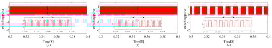 Figure 11 illustrates the pulse signals and their locally magnified details under three different control schemes. It is evident that the ET-MFAC method exhibits a lower wave-form density, effectively reducing the number of switching actions. Within the simulation model, the average switching frequency during the 0–0.4 s simulation time was measured for each method. FCS-MPC resulted in 10,650 switching actions, while PIR-MPC achieved a reduction of 660 actions (approximately 6%), totaling 9990 actions. Notably, ET-MFAC exhibited the lowest switching frequency with 8625 actions: a significant reduction of 2025 actions (19%) compared to FCS-MPC and 1365 actions (12%) compared to PIR-MPC.