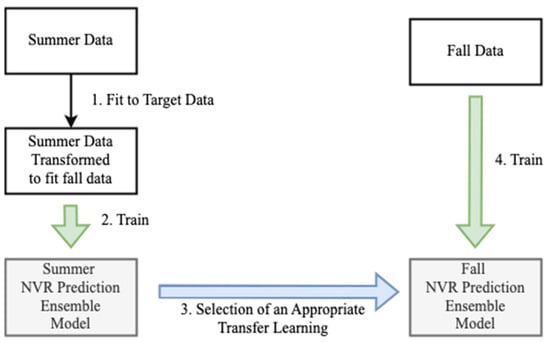 This research seeks to facilitate effective knowledge transfer across diverse seasonal and spatial data contexts. The tuning and hyper-parameterization of models for efficient knowledge transfer is a subject of active research [26,27,28]. In particular, methods of transfer learning based on the similarity between data domains have been explored, as have the transfer learning domains contingent on the size and resemblance of source and target data [5,29]. We propose a more effective approach to knowledge transfer by selecting and training in a transfer learning domain that is well-suited to the environmental data for NVR prediction, surpassing the efficacy of conventional knowledge transfer methods.