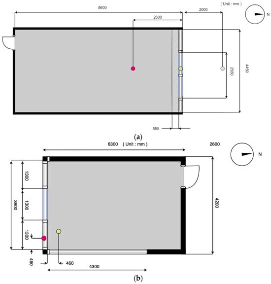 Floor plan of the environmental data experiment space: (a) Summer data environment, (b) Autumn data environment. This figure illustrates the layout of the offices where data were collected, providing context for the spatial variations considered in the study. red dots and green dots represent indoor and outdoor environmental variable measuring sensors. pink dots represent sensors for measuring natural ventilation.