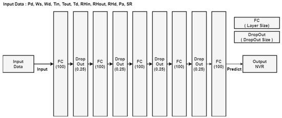 The structure of the Foundation NVR prediction model proposed in this study is illustrated in Figure 2. This predictive model comprises five layers, each consisting of 100 nodes, adopting a configuration of [100, 100, 100, 100, 100]. To address the issue of model overfitting, a DropOut layer was incorporated after each layer. In terms of detailed model settings, the ReLU activation function was employed after each layer to prevent the Gradient Vanishing problem common in regression tasks [22,23,24]. The proportion of nodes to be deactivated during the learning process in each DropOut layer was set to 25%. The optimization function used during the model training process was Adam, with a learning rate set at 0.001.
