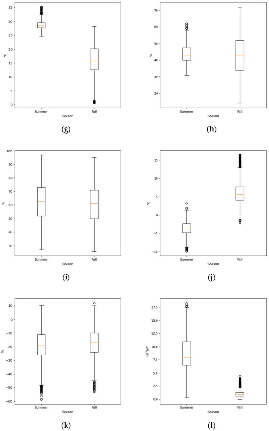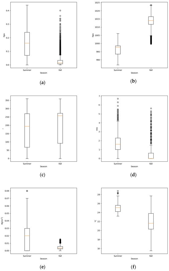 Figure 4 illustrates a box plot representation of the data (Pd, Pa, Wd, Ws, SR, Tin, Tout, RHin, RHout, Td, and RHd) used for NVR prediction, highlighting the seasonal differences encountered within NVR environments during summer and autumn. Key influencers on NVR, Pd, and Ws exhibited substantial differences between seasons, mirroring the seasonal variance in NVR and validating a significant correlation. Specifically, the critical factor Wd displayed an average seasonal angular difference of 50°. In the case of Td, it was observed that more than 98% of values were below zero during summer, while more than 97% exceeded zero during autumn, indicative of internal temperatures being lower than external temperatures due to summer cooling and vice versa due to autumn heating. Such contrasting behaviors of Td across seasons could lead to incorrect knowledge transfer when implementing Transfer Learning, underscoring the need for preprocessing that accounts for these seasonal characteristics prior to transfer. Tin and Tout also confirmed higher readings during the summer when considering seasonal attributes, as compared to the autumn. SR exhibited substantial differences due to the variance in solar elevation between the seasons. In contrast, humidity-related parameters such as RHin, RHout, and RHd, though marginally higher in summer due to seasonal traits, did not show as pronounced differences as the other factors. Consequently, Figure 4 facilitates the verification of seasonal data variation due to distinct seasonal traits. This paper highlights the need for effective knowledge transfer, taking into account the above distinct seasonal differences.