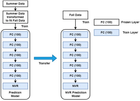 Previous studies have shown that when using transfer learning in an environment where the source data are small and not very similar to the target data, it is effective to freeze the upper layers and retrain the remaining layers [26,29]. Based on the previous research, we propose freezing the upper layers and retraining the lower layers for NVR prediction. Figure 5 shows the transfer learning model proposed for NVR prediction with freezing the upper layers and retraining the lower layers. In our model, the PredTrain is created by training on source data that has undergone the normalization assumptions proposed in Section 3.3 and then conducting transfer learning on the target data. Based on previous research, we experimentally explored the appropriate transfer learning domain for the data environment by sequentially freezing the layers from the top to the bottom in the Foundation DNN-Based NVR Prediction model. Our transfer learning approach involved freezing the upper layers of the model and retraining the lower layers to adapt to the new data environment. This method leverages pre-existing knowledge while fine-tuning the model for specific target domains.