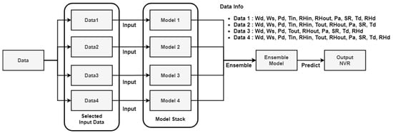 Figure 6 illustrates a bagging-based ensemble model for NVR prediction. For the selection of training data for the bagging-based ensemble model, principal characteristics used for NVR prediction such as Pd, Wd, Pa, and Ws were included, and the remaining data, including SR, Tin, Tout, RHin, RHout, Td, and RHd were dependently selected and explored through greedy search. The selected training data are categorized into four types: Data 1 (Pd, Pa, Wd, Ws, SR, Tin, RHin, RHout, Td, and RHd), Data 2 (Pd, Pa, Wd, Ws, SR, Tin, Tout, RHin, RHout, and Td), Data 3 (Pd, Pa, Wd, Ws, SR, Tout, RHout, Td, and RHd), and Data 4 (Pd, Pa, Wd, Ws, SR, Tin, Tout, RHin, RHout, Td, and RHd). These four types of training data are used for the foundation NVR prediction model, which has the same model structure, and an aggregation of each Foundation NVR model trained on these four types of data are used to predict NVR.