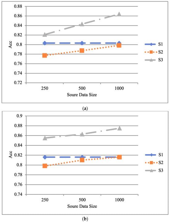 Figure 7 presents a comparative analysis of scenarios S1, S2, and S3 during summer and autumn. Scenario S1 demonstrates that it maintains consistent prediction capabilities without the influence of Transfer Learning (TL). In Scenario S2, an observed slight improvement in the Area Under the Curve (AUC) as the source data size increases implies that a greater volume of data within TL may provide some performance benefits. However, such improvements did not exceed the performance of S1, which could indicate that the knowledge transfer has not occurred effectively. This ultimately suggests potential limitations in the model’s capacity to adapt to new data without normalization. Scenario S3, in contrast, exhibits a clear advantage, showing a consistently higher AUC across all data sizes when compared to S1 and S2. Notably, as the source data size increases, there is a trend toward continuous performance enhancement, which suggests that the model’s ability to generalize from the source domain to the target domain has improved.