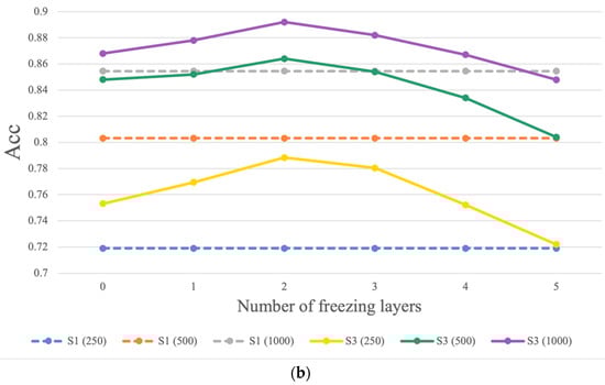 The degree of performance improvement across all target data sizes consistently shows the highest accuracy when two layers are frozen, with up to a 7% improvement in accuracy achievable. Notably, in the scenario S3 (500), when the number of frozen layers ranges from 1 to 3, it outperforms the S1 (1000) scenario. This suggests that optimized Transfer Learning can overcome the potential limitations associated with smaller amounts of target data.