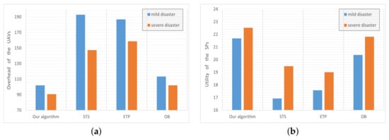 Moreover, many studies have been dedicated to post-disaster relief [,,,]. In [], the authors proposed a network architecture for UAVs and ground vehicles in which the UAV and the ground vehicle can communicate with each other through air-to-ground (A2G) communication. The UAVs in this system not only perform information acquisition but also act as relay stations when communication among ground vehicles is blocked. In [], the authors explored a fog computing-based UAV system which allows for collaboration between UAVs and unmanned ground vehicles (UGVs) by designing and implementing a matching iterative algorithm. This scheme effectively improves the utilization of UAVs and reduces the average delay. Xu et al. [] developed an example of a UAV system that can quickly obtain disaster site information; it can be used to acquire disaster images with different resolution parameters and was applied to the 7.0 magnitude earthquake in Lushan, Sichuan, China. In [], the authors described a data acquisition framework based on the collaborative processing of UAVs and IoT. In [], the authors investigated UAVs by utilizing their mobile communication and computing functions to assist local area networks in building a UAV-assisted, multiple-access edge-computing system when the communication infrastructure is not available. Unlike existing post-disaster relief efforts, we innovatively proposed utilizing SPs as assistance computing devices to aid UAVs in completing a large number of post-disaster rescue tasks.