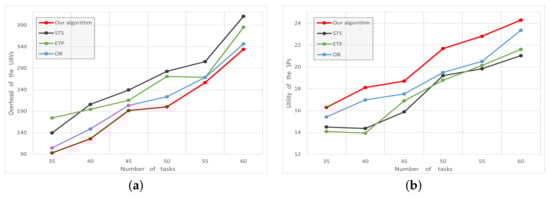 Variation in system performance with number of tasks in mild disaster scenario. (a) Variation in total UAV overhead with number of tasks. (b) Variation in total utility of SPs with number of tasks.