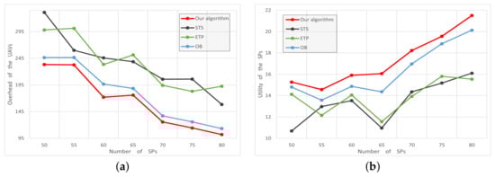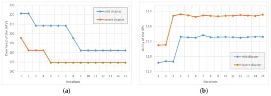 Variation in system performance with number of SPs in mild disaster scenario. (a) Variation in total UAV overhead with number of SPs. (b) Variation in total SPs utility with number of SPs.