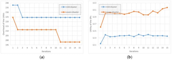 As shown in Figure 5, we conducted experiments on the performance of the algorithm as iterative convergence in two environments. It can be seen that at the beginning of the iteration, the two objects obtained by the initial allocation of the system have not yet achieved the best optimization effect. As the algorithm iterates, the two objectives are continuously optimized. By continuously optimizing the task allocation scheme, the overhead of UAVs is reduced and the utility of SPs is gradually increased. And convergence is achieved in fewer cycles. This reflects the effectiveness of our algorithm and its ability to converge quickly.