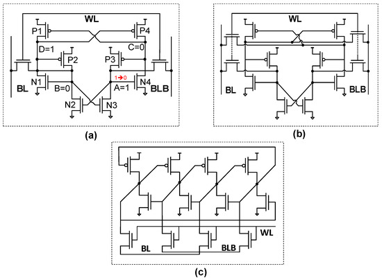 Many soft error-resilient SRAM cells have been devised [10,11,12,13]. The 12T DICE [13] and 10T Quatro [11], as shown in Figure 1, are the most widely known ones. Some works have proven their good soft error resilience through actual tests. These two SRAM cells have dual-interlocked cell structures, where each memory node becomes the gate input of N-Fets and P-Fets to drive different memory nodes. Hence, single-event upset (SEU) [5,6,14] does not directly cause cell data flipping. For example, as shown in Figure 1a, The 10T SRAM Quatro, with the initial state (A = D = 1, B = C = 0), considers a scenario where a radiation particle impacts node “A”, thus temporarily reducing its potential and changing A from 1 to 0. This may weaken the pull down of N2 and N4. However, the voltages at nodes “B” and “C” remain largely unaffected (still 0), as this disturbance does not impact P1 and P4. Consequently, the voltage at “A” will return to its supply level after the radiation particle strike. As a result, the original cell data are preserved.
