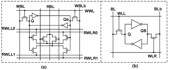 Table 1 also shows the biasing of the read operation, where only WL1 is activated. In the BL switching circuit (Figure 3b), SW1, SW3, SW5, and SW6 are OFF. Meanwhile, SW2 and SW4 are ON; then, the stored value in the SRAM cell is sensed at the end of BLLEFT and BLRIGHT by using a current sense amplifier (CSA) [19].
